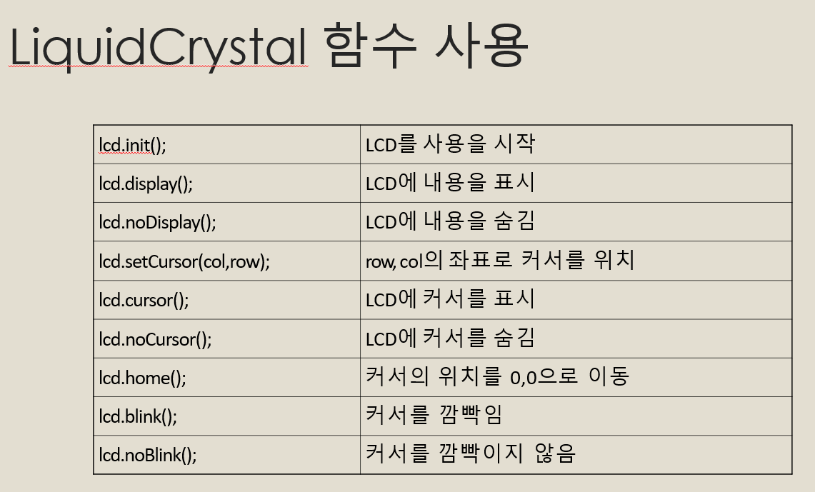 lcd.home(); // cursor의 위치를 0,0으로 이동